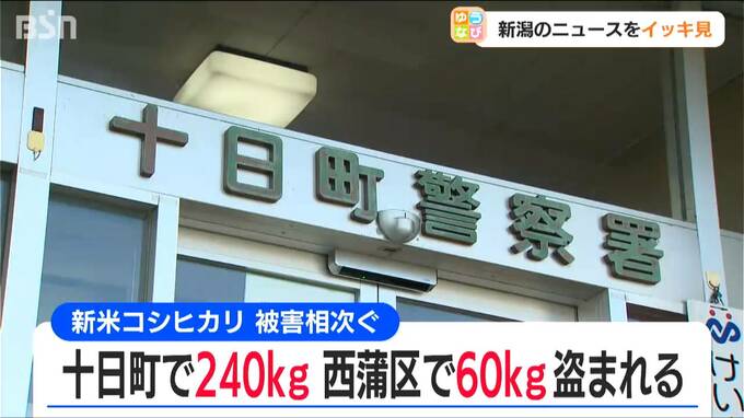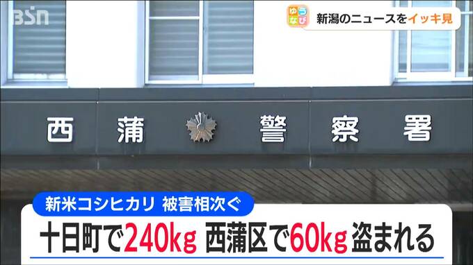 さらに十日町市では17日に、コシヒカリの新米240kgが盗まれる被害があったと届け出がありました。また、新潟市西蒲区でも19日にコシヒカリの新米60kgが盗まれたと届け出がありました。