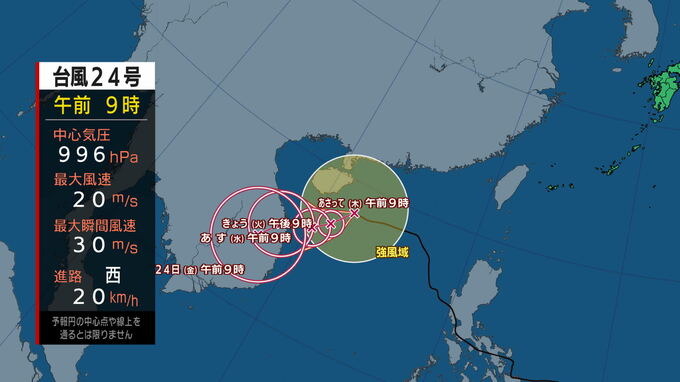 「台風24号」は、南シナ海を西に進んでいます。日本から離れていくため、この台風の影響はありませんが、新たな「台風のたまご=熱帯低気圧」が、沖縄県の石垣島付近で発生しました。21日(火)~26日(日)の《雨風シミュレーション》を画像で掲載しています。