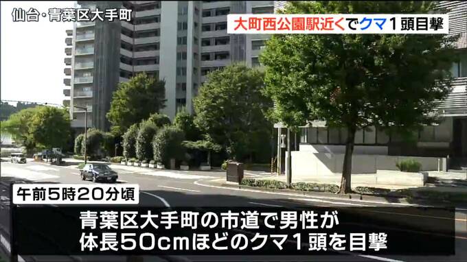 21日早く、仙台市営地下鉄東西線の大町西公園駅近くの市道でクマ1頭が目撃されました。警察が、住民に注意を呼びかけ、付近をパトカーで警戒しています。