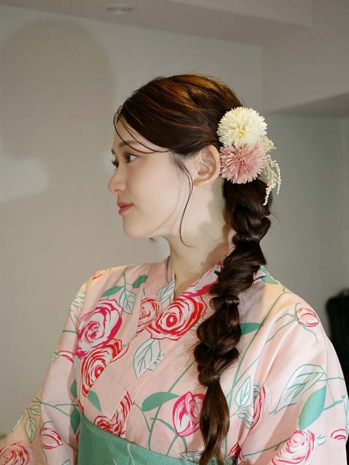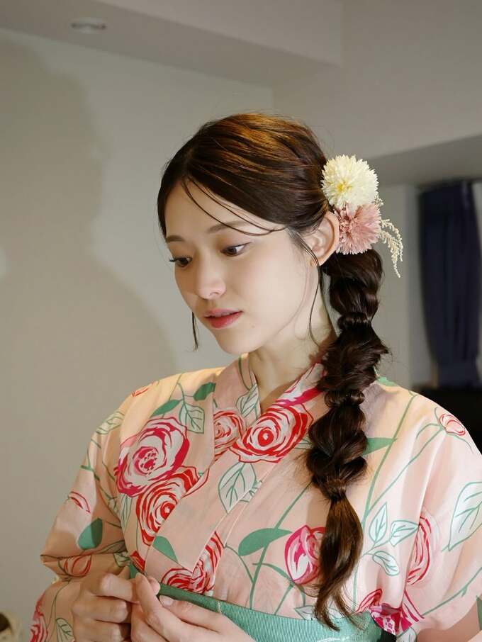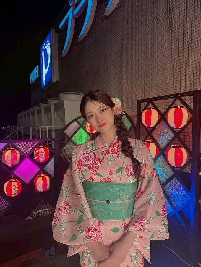 松村さんは淡いピンク地に赤い薔薇の花柄と緑の葉が描かれた浴衣姿で登場。緑系の帯を合わせ、長い髪をまとめ、耳の横には白と薄いピンクの花の髪飾りをつけるなど、和の装いを楽しんでいる様子が投稿されています。