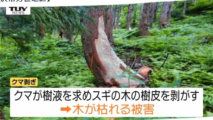 ツキノワグマが樹液を求めてスギの木の樹皮を剥がす「クマ剥ぎ」により、米沢市など置賜地方を中心に木が枯れるなどの被害が出ているということです。
