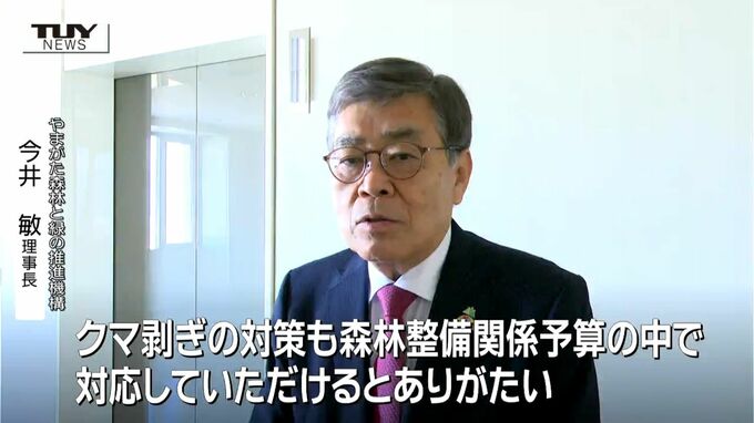 やまがた森林と緑の推進機構 今井敏 理事長「理解の醸成につとめながら少しずつ前進していこうと(県から)お言葉をいただいた。人間が安心して山で作業できるような環境整備も重要だが、あわせてクマ剥ぎの対策も森林整備関係予算の中で対応していただけるとありがたい」