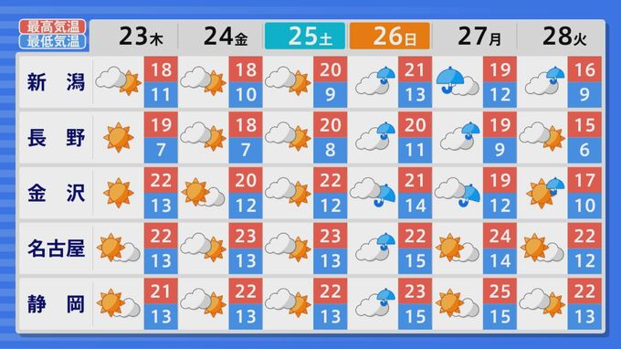 前線が日本の南海上にあるため、日本海側では北よりの風で気温が低くなるでしょう。北陸では、最高気温が20度前後の見込みです。週明けは、最低気温、最高気温ともに平年より低いでしょう。