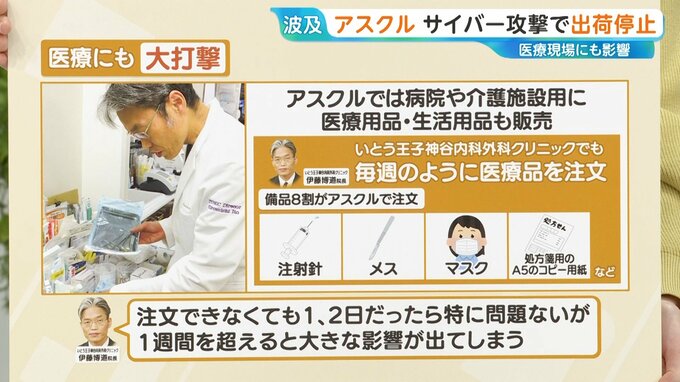 いとう王子神谷内科外科クリニックの伊藤院長に聞くと、注射針・メス・マスク・処方箋用のコピー用紙など、備品の約8割をアスクルで注文しており、「注文できなくても1日2日だったら特に問題はないが、1週間を超えると大きな影響が出てしまう」と話しています。