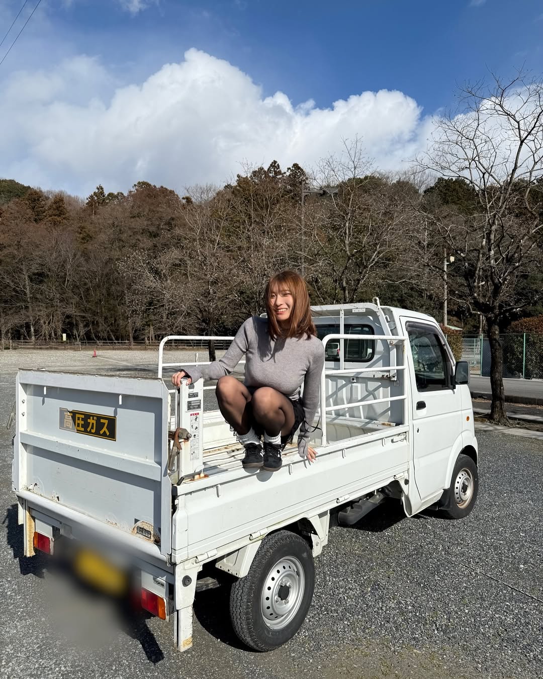 三田さんは「愛車は軽トラ三田悠貴です」と、ハッシュタグ「#軽トラ女子 #マニュアル #グラビア」などを添えて投稿。