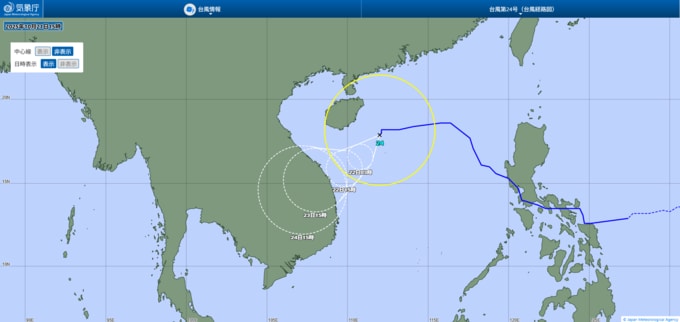 この情報によりますと、21日午後3時現在、南シナ海の海上にある『台風第24号(フンシェン)』は、今後、時速15km~10km以下のゆっくりとしたスピードでジリジリとベトナムへ向かって進んでいく見込みです。台風24号は24日午後3時までにはラオスで熱帯低気圧に変わる見込みです。