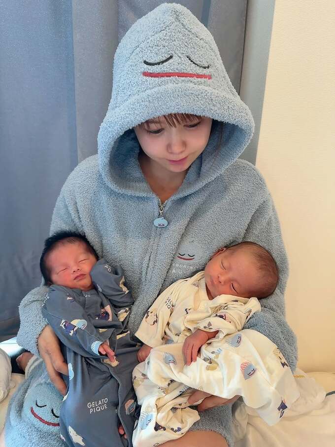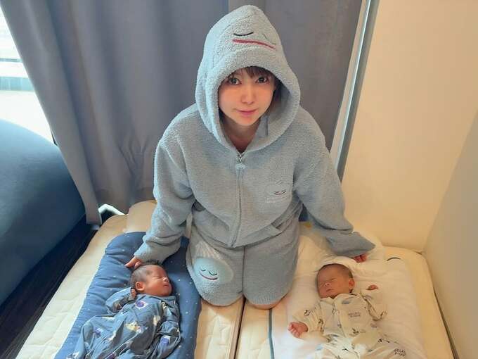 翔子さんは、大ヒットゲームシリーズ「ドラゴンクエスト」のゲームデザイナー・堀井雄二さんからプレゼントを贈られたとして「ドラクエジェラピケ!欲しかったんです〜」「双子と親子コーデ叶いました!」と、母&双子の3ショット写真を投稿。