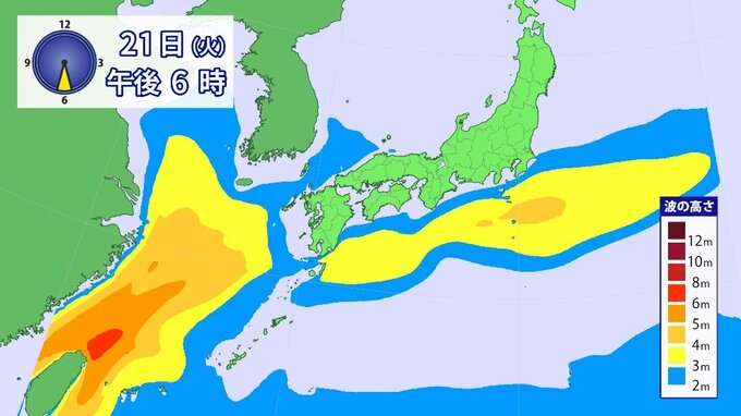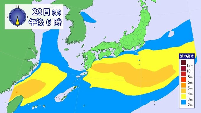 「前線付近や南西諸島を中心に強風となる見込みであるため、風の強まりに注意してください。さらに、風が強まることで波が高くなり、先島諸島や伊豆諸島では木曜日ごろにかけてしける見通しです。気圧の傾きの程度によっては大しけのおそれがあります【画像⑦⑧⑨】」