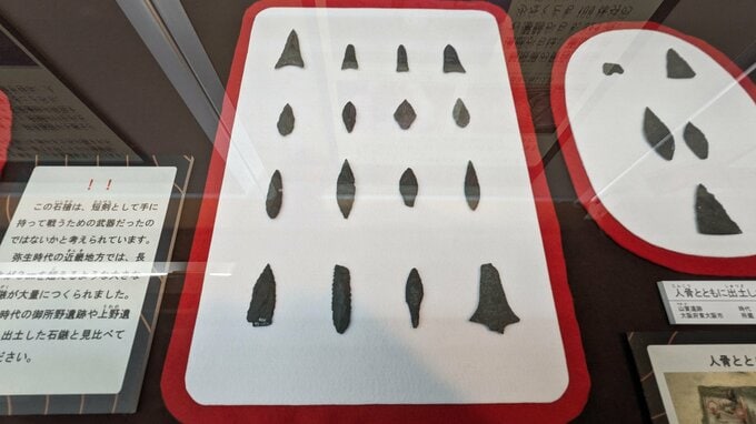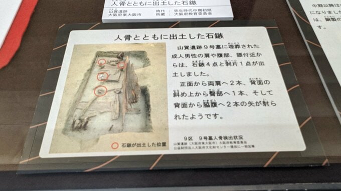 まず、矢尻の大型化が始まり、破壊力が増した弓矢で対人攻撃をしていた様子が見て取れます。また、発掘された人骨とともに石の矢尻(石鏃)が発掘されており、この人物は弓矢による攻撃を受け、亡くなったことが想像されます。