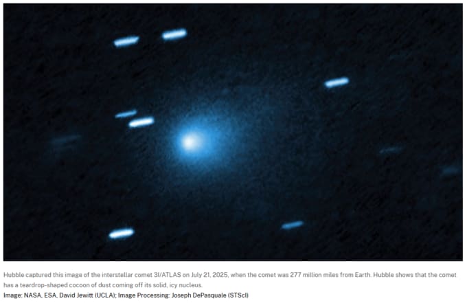 ハッブル宇宙望遠鏡による観測では、「3I/ATLAS」の核から出たちりなどが彗星の尾のようになる兆候が確認されているということです。