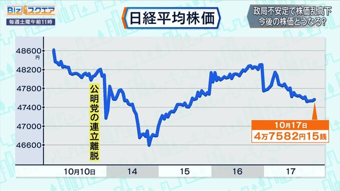 公明党の連立離脱を受け、一時大きく下げた日経平均株価も自民党と日本維新の会との接近を受け反発するなど、政局で乱高下する展開となった10月の第3週。
