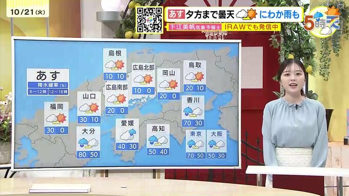 きょう21日(火)の広島県内は、おおむね曇った一日になりました。季節が大きく前進し、多くの地点で最低気温・最高気温ともに、この秋一番低い気温になりました。最高気温は、加計以外のすべての地点で今季一番…