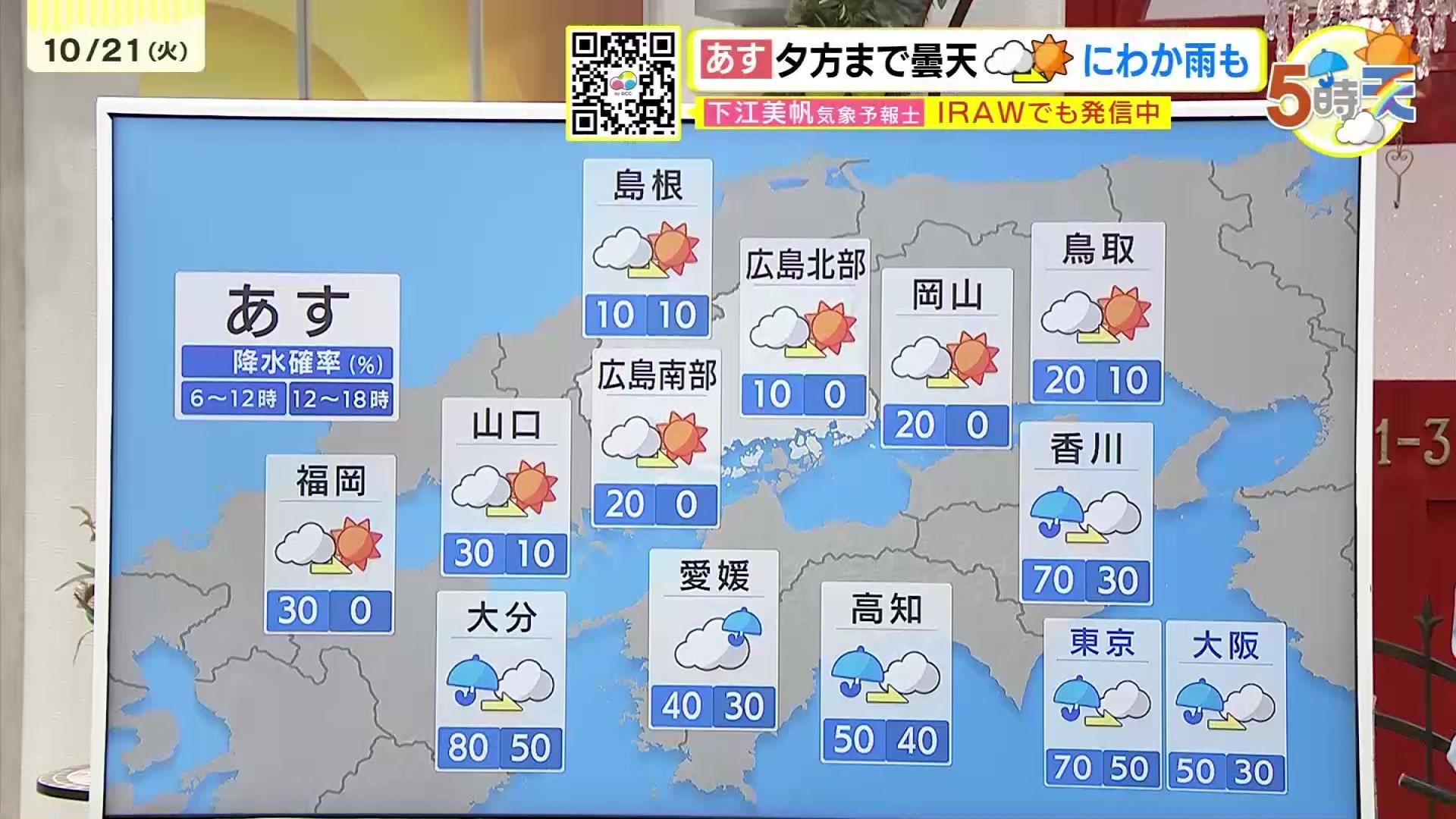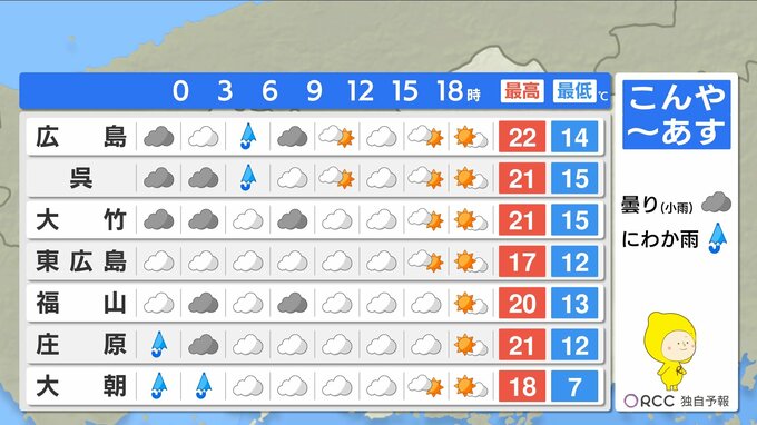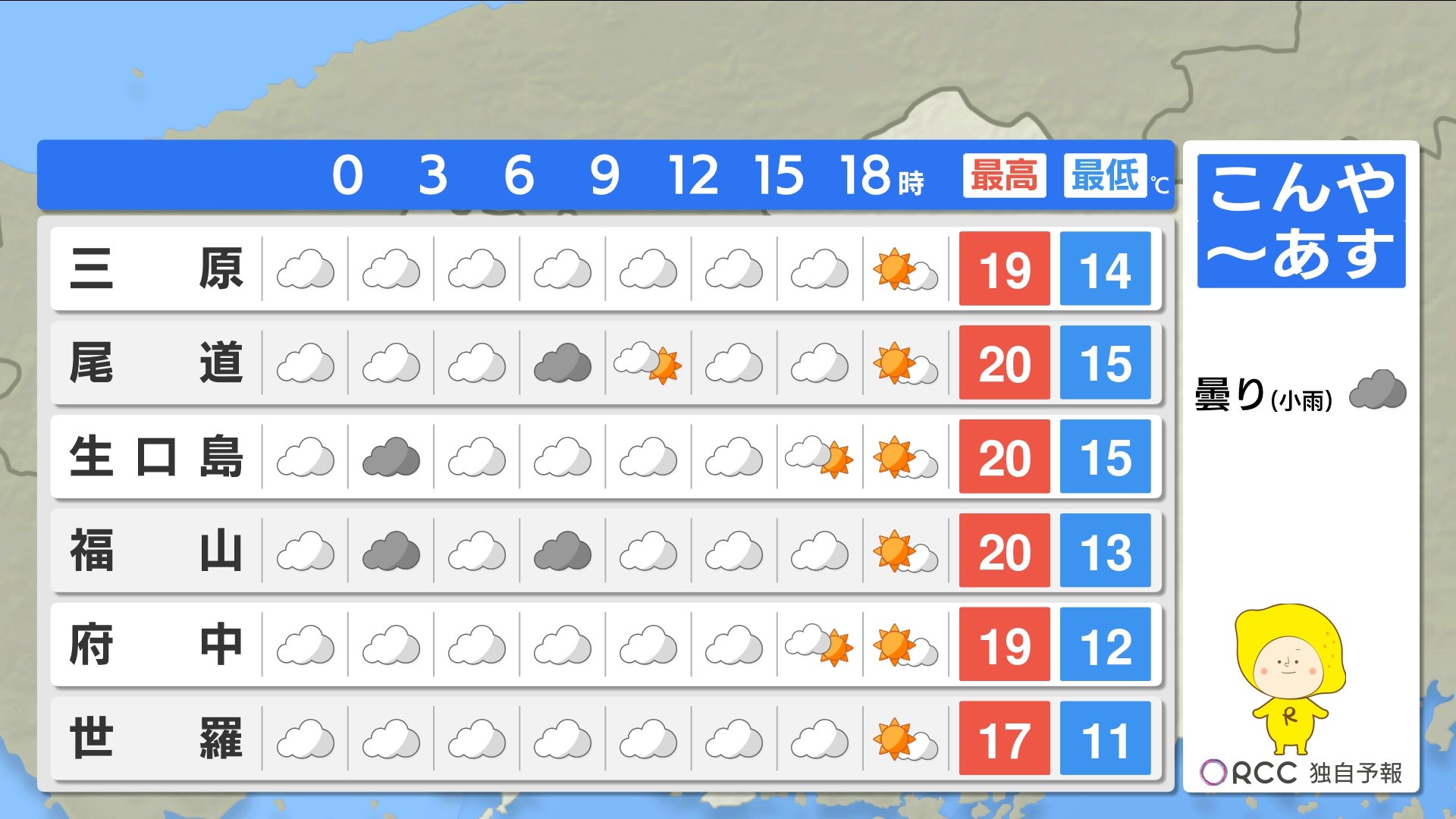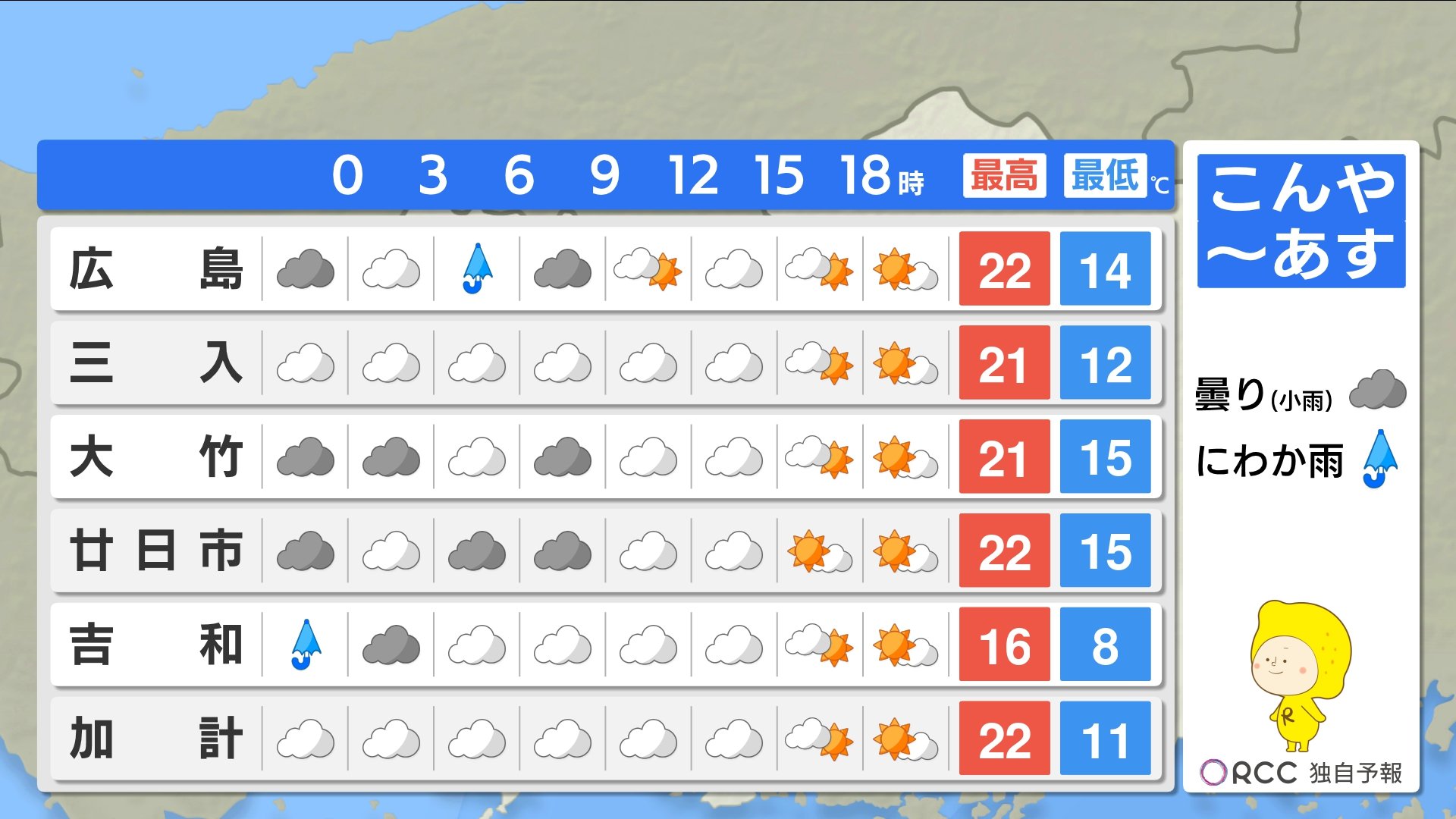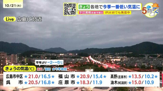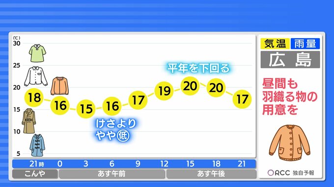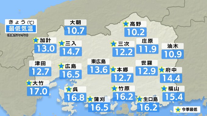 きょう21日(火)の広島県内は、おおむね曇った一日になりました。季節が大きく前進し、多くの地点で最低気温・最高気温ともに、この秋一番低い気温になりました。最高気温は、加計以外のすべての地点で今季一番低い気温になり、平年より2℃~5℃ほど低くなりました。北風が吹いてかなり肌寒い一日になりました。