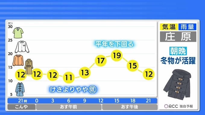 あす朝にかけてもぐっと気温が下がります。北部では山沿いを中心に最低気温が1ケタの地点が出る予想です。コートなど本格的な冬物の出番となります。最高気温は平年をやや下回る地点が多く、あすも北風が吹いてかなり肌寒く感じられるでしょう。昼間もカーディガンやセーターなど厚手の長袖があった方が良いでしょう。