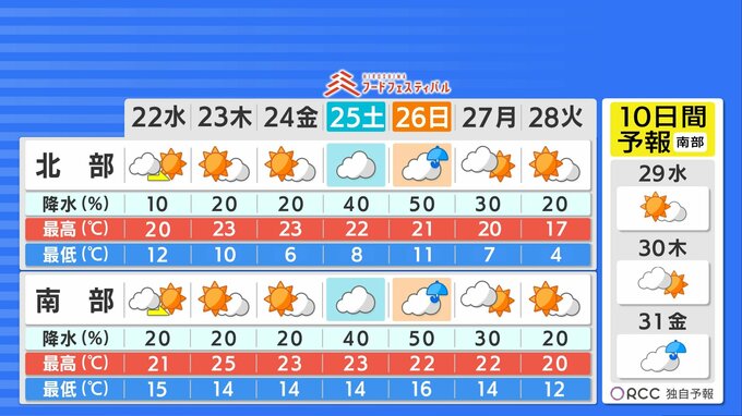 金曜日頃まで秋雨前線が本州の南に停滞し、大陸の秋の高気圧が張り出し、おおむね晴れる予想です。週末はすっきりしない予想で、雨が降りやすくなるでしょう。最高気温は、南部で22℃~23℃の日が多く、おおむね平年並でこの時期らしい気温が続くでしょう。北部ではあす以降最低気温が10℃を下回る地点が多くなるでしょう。本格的な冬物のダウンやコートが必要となりそうです。来週になると朝晩の冷え込みはさらに強まるでしょう。