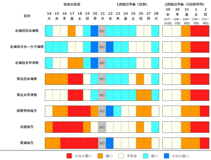・2週目の予報は中心の日に前後2日間を加えた5日間の平均(平均気温の5日間平均)です。平均期間は中心の日の下に表示しています。2週目のかなり高い(かなり低い)は、かなり高い(かなり低い)気温となる確率が30%以上のときに表示します。