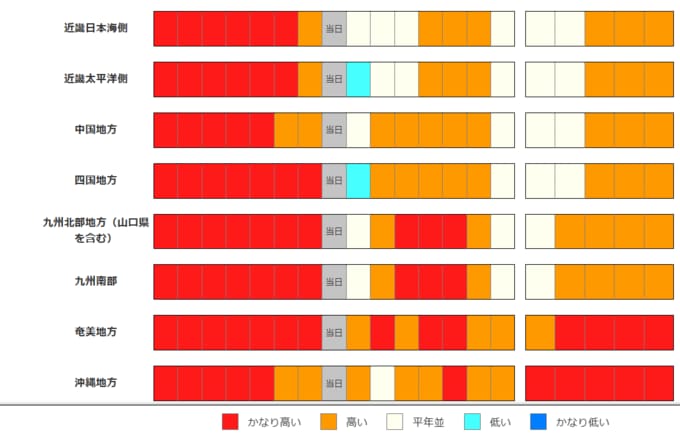 沖縄・奄美の向こう2週間の気温は、暖かい空気に覆われやすいため高く、かなり高い日が多い見込みです。農作物の管理等に注意してください。