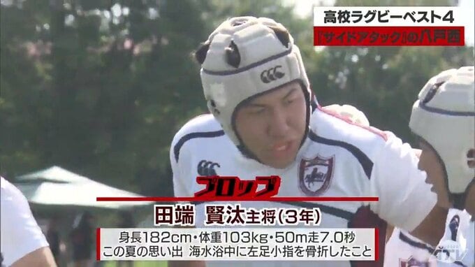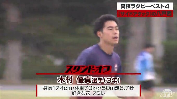 誰にパスをまわすのかを的確に判断し、ゲームメークに長けた攻撃の起点です。準々決勝の八戸工業戦では、リードを許したまま迎えた試合終了残り1分で逆転トライを決め、3年ぶりのベスト4進出に導きました。
