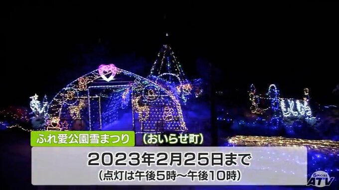 6日は雪がちらついて、いっそう幻想的な雰囲気に包まれました。おいらせ町の「ふれ愛公園雪まつり」は、2023年2月25日まで開催され、イルミネーションは毎日午後5時から午後10時まで点灯されます。