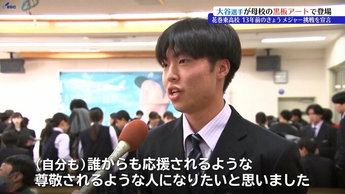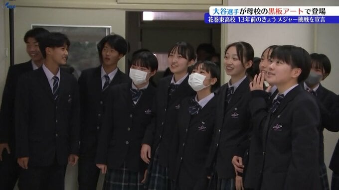 メジャーリーグで活躍する大谷翔平選手の母校、花巻東高校で偉大な先輩を描いた黒板アートが披露されました。