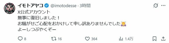 イモトさんは自身のXアカウントで「X公式アカウント 無事に復旧しました!」と報告。「お騒がせご心配をおかけして申し訳ありませんでした」と、お辞儀の絵文字を添えて陳謝しています。