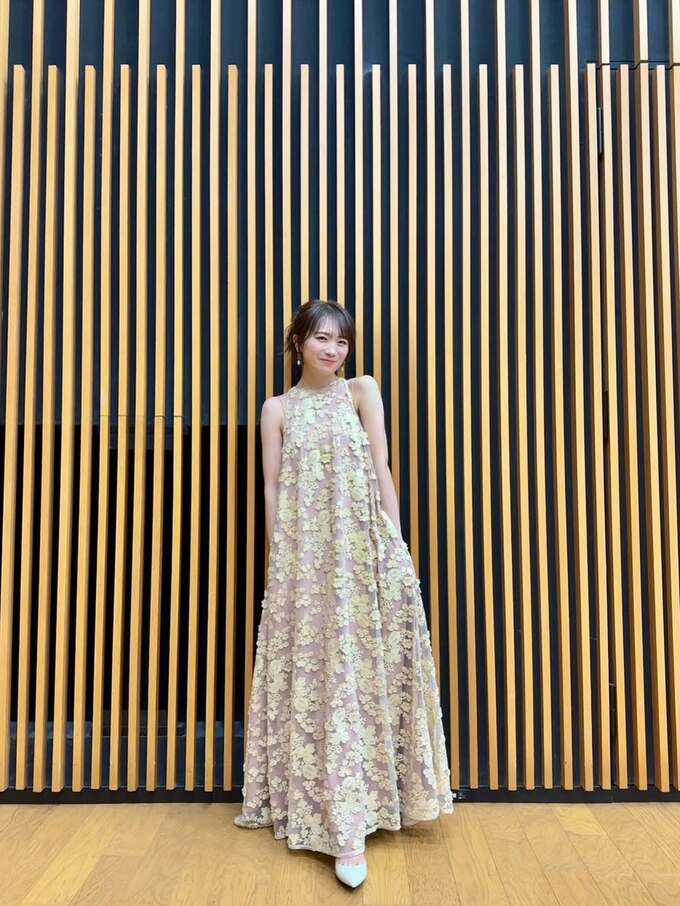 さらに、薄いベージュの下地に花柄があしらわれた、ノースリーブのマキシドレスを身にまとった姿も見られます。