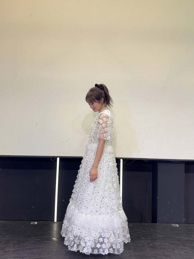投稿では、イベントで着用した衣装に身を包んだ画像も公開しています。花柄の模様が全面にあしらわれた、白いレースのロングドレスは、ボリュームのあるスカートが特徴的です。