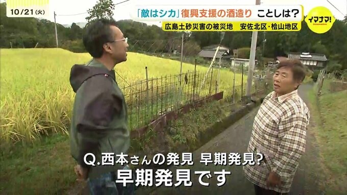 そこで、ことしはネットの支柱を強化。シカの隠れ家になっていたすぐ裏手の山の木を切るなど防御を固めました。ところが…田植えから半月ほどたった頃田んぼにシカが侵入苗を食べていたのです。そのシカを一早く見つけたのは近所の西本さんでした。