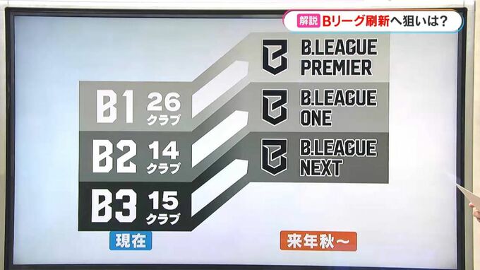 今シーズンのBリーグは、B1、レブナイズを含むB2、そしてB3あわせて55クラブが参戦しています。これが来年秋から、Bリーグプレミア、ワン、ネクストの3つのカテゴリーに変わります。