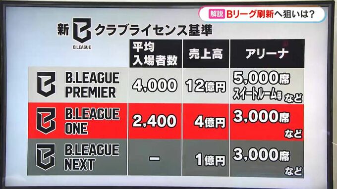 最上位の「プレミア」に入るには、▼平均入場者数4000人▼売上12億円▼アリーナは座席数5000以上で、大型の映像装置やVIPルームを備えるなど、こうした基準を満たす必要があります。初年度は長崎や佐賀、島根など地方を含む26クラブが参入を決めています。