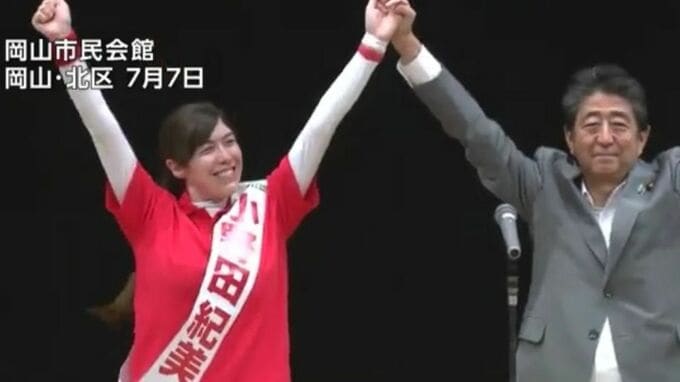 新たな内閣では、参議院岡山選挙区選出の小野田紀美議員が経済安全保障担当大臣として入閣することが決定しています(【画像①】は2022年7月7日に安倍元総理と壇上に上がる小野田議員)。