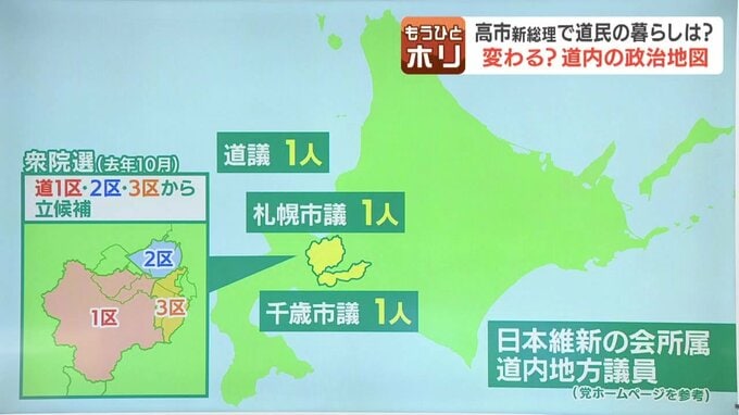 連立を組む維新は、党のホームページによると、道内の自治体で活動する地方議員は現在、道議1人と札幌市議1人、千歳市議1人の合わせて3人です。