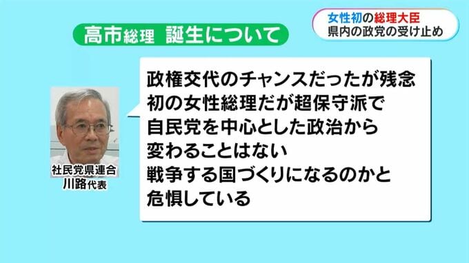 社民党県連合・川路孝代表は「政権交代のチャンスだったが、残念。初の女性総理だが、超保守派で自民党を中心とした政治から変わることはない。戦争する国づくりになるのかと危惧している」