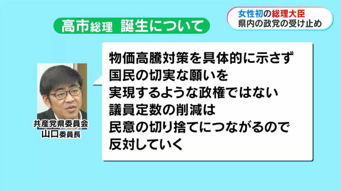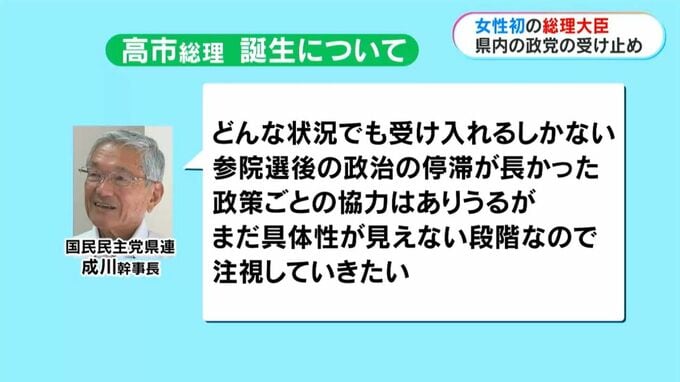 (自民党県連 藤崎剛 幹事長)「女性初の内閣総理大臣ということで、憲政史上でも非常に画期的なこと。歴史の1ページをめくったと感じている。どういう連立の協議体の中で協議していくのか、党の中で議論していくのか、時折は地方の立場からいろいろな意見を申し上げたい」