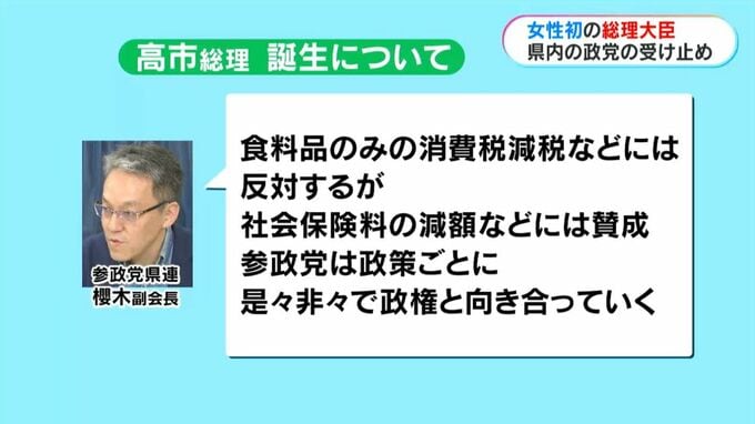 参政党県連・櫻木隆副会長は「食料品のみの消費税減税などには反対するが、社会保険料の減額などには賛成。参政党は政策ごとに是々非々で政権と向き合っていく」とコメントを発表しました。