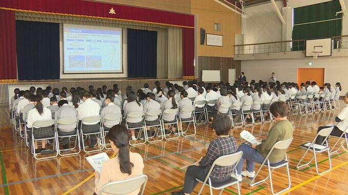 県内で初めて行われた復興庁の出前授業には、厚狭明進高校の1年生およそ110人が参加。「福島の復興」をテーマに、中橋宗一郎参事官が津波や原発事故の被害状況のほか、現状などを説明しました。