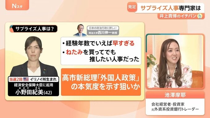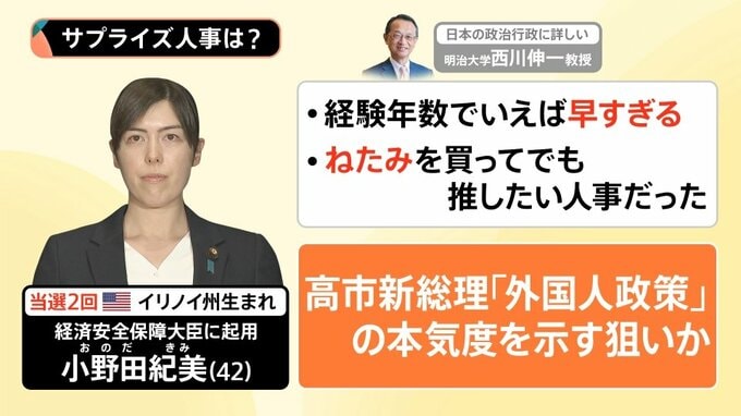 明治大学の西川教授は、▼経験年数で言えば早すぎる、▼ねたみを買ってでも推したい人事だったのではと分析。高内新総理の「外国人政策」の本気度を示す狙いがあるのではないかとしています。