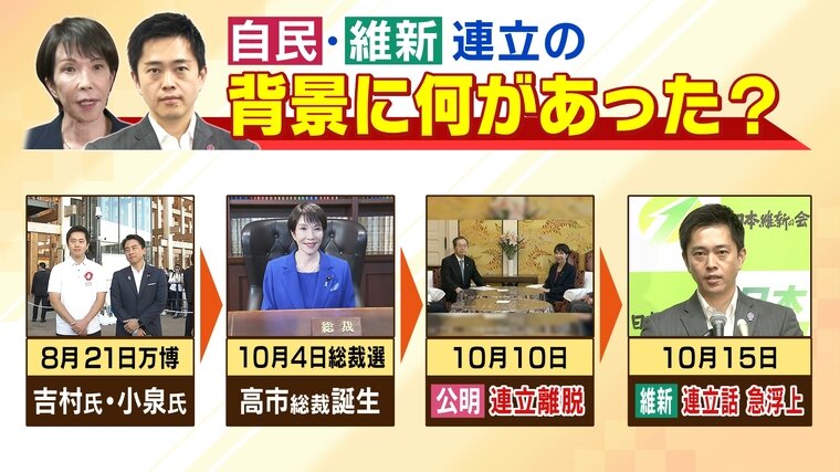 時系列で振り返ると、吉村代表と小泉進次郎氏の連携で連立が成立するかと、自民党総裁選の前に言われていました。しかし、10月4日に高市総裁が誕生し、国民民主と連立するのではと言われていた矢先に、10月10日公明党が連立を離脱。その後10月15日急浮上したのが維新との連立です。
