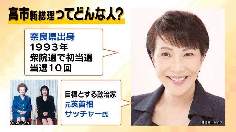 奈良県出身の高市新総理は1993年に衆院選で初当選。当選10回で、目標とする政治家はイギリスの元首相で“鉄の女”とも呼ばれたマーガレット・サッチャー氏です。