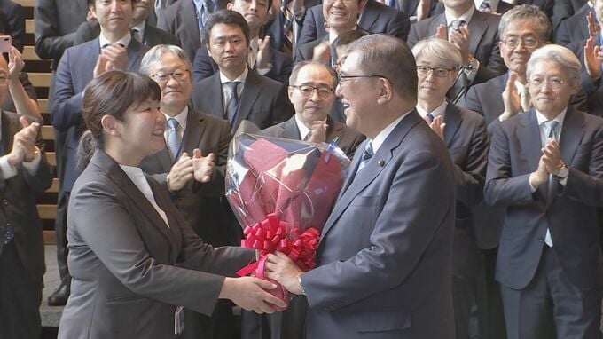 午後0時半頃、総理官邸でセレモニーが行われ、拍手の中、石破総理が花束を受け取りました。