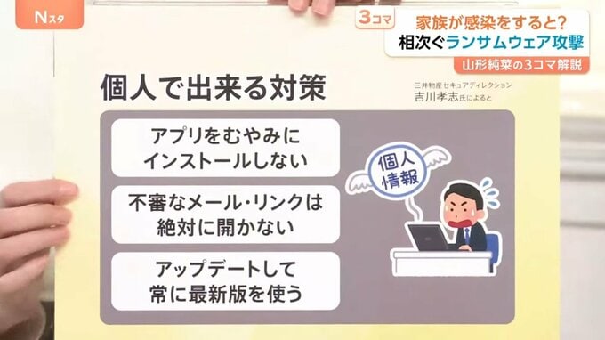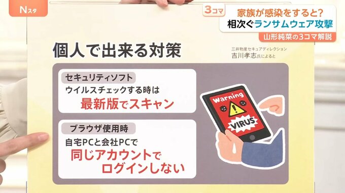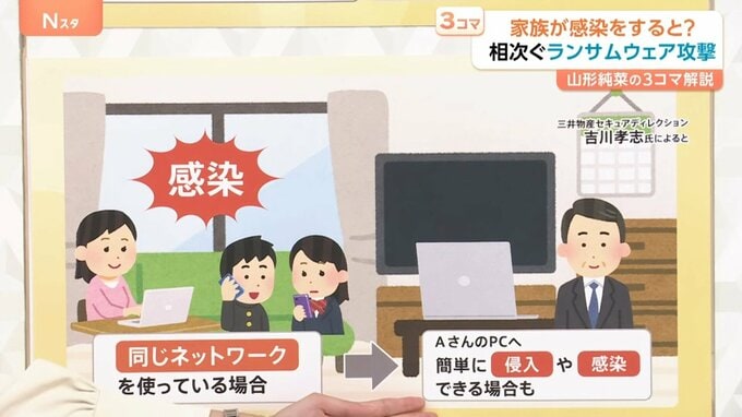 家庭内でも注意が必要です。吉川さんによると、家族のパソコンやスマホがウイルスに感染すると、同じネットワークに接続している他のデバイスにも簡単に侵入や感染できる場合もあるというのです。