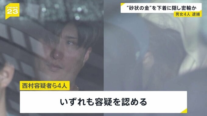 金を密輸しようとしたとして男女が逮捕です。逮捕されたのは、草加市の西村昌盛容疑者(34)と、足立区の大坪美香容疑者(30)ら4人です。4人は去年7月、砂のような状態にした金、およそ8キロ、9870万円相当を下着…