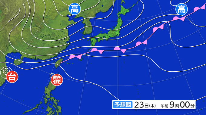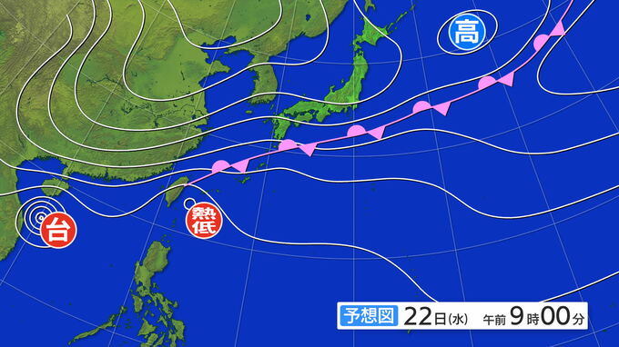 気象庁によりますと、秋雨前線が台湾付近から種子島・屋久島付近、伊豆諸島付近を通って、日本のはるか東にほとんど停滞しているということです。詳しい天気図と今後の天気シミュレーションについては「22日(水)~27日(月)の雨と風のシミュレーション画像」にて掲載しています。