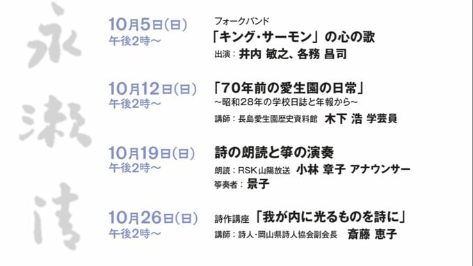 永瀬清子さんの詩「星座の娘」を箏曲に「重力があり苦しみがあり意志があり光がある」箏曲家・景子さんが初披露【岡山】 RSK山陽放送 2025年10月22日(水) 19:00 国内 小林章子 「詩人 永瀬清子とハンセン病文学の読書室」 「詩人 永瀬清子とハンセン病文学の読書室」では、毎週日曜午後2時から、永瀬清子さんやハンセン病、福祉などをテーマにした講演会や朗読会が開かれています。 10月、11月の予定です。
