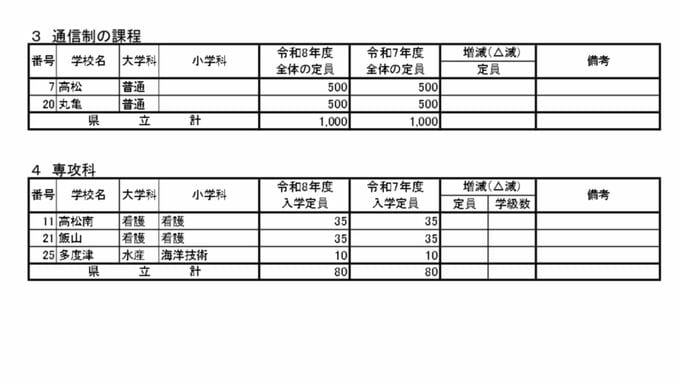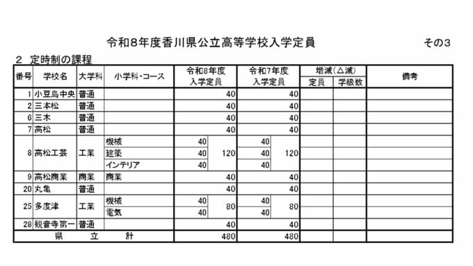 定時制の小豆島中央・三本松・三木・高松・高松工芸・高松商業・丸亀・多度津・観音寺第一の募集定員は【画像⑤】の通りです。