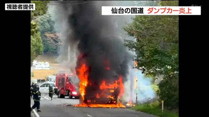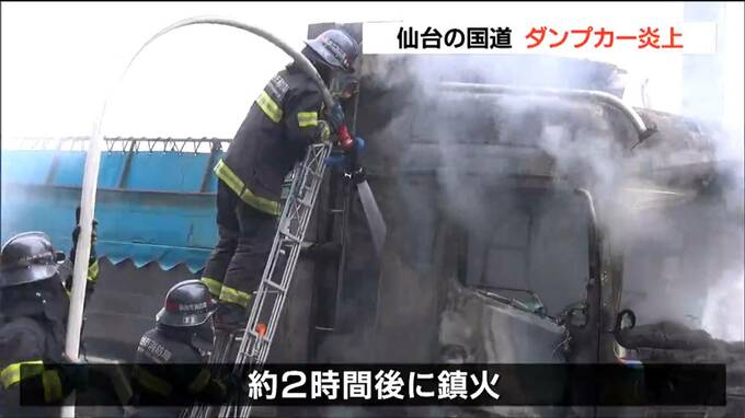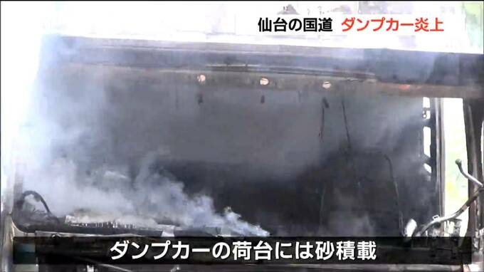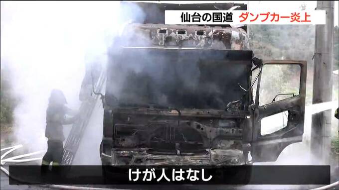 22日朝、仙台市内の国道で走行中のダンプカーが焼ける火事がありました。けがをした人はいませんでした。