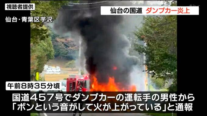 22日午前8時35分頃、仙台市青葉区芋沢の国道457号でダンプカーの運転手の男性から「ボンという音がして火が上がっている」と警察に通報がありました。