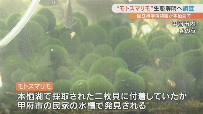 今回の調査の目的であるマリモは本栖湖で採取された二枚貝に付着していたと考えられることから「モトスマリモ」と名付けられたもので、甲府市の民家の水槽で見つかりました。