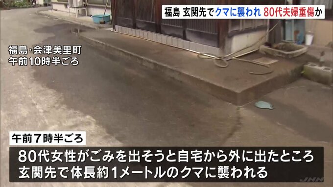 けさ、福島県会津美里町で80代の夫婦が自宅の玄関先でクマに襲われ、けがをしました。警察などによりますと、きょう午前7時半ごろ、会津美里町で80代の女性がごみを出そうと自宅から外に出たところ、玄関先で体長…