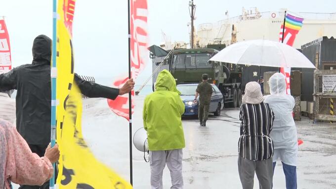 自衛隊統合演習に向け搬入されたもので、車両は公道を通り、航空自衛隊宮古島分屯基地に運び込まれました。平良港では公道に出ようとする自衛隊車両の前で抗議する市民の姿もありました。